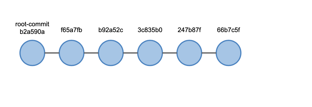 Root-commitul este primul commit din istoric (b2a590a8637f1eab96e557334dbd4be14bf95833, b2a590a) 1. Toate celelalte commituri vin în continuarea acestuia. Spre exemplu, al doilea commit (f65a7fbe8bbe1b36ba5c8e16607456a879bfb6fa, f65a7fb) a avut la bază primul commit (b2a590a). Modificările au fost făcute peste commitul b2a590a.